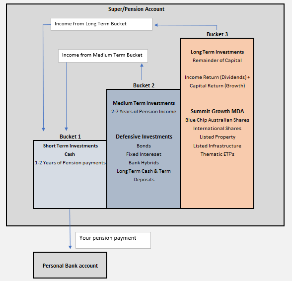 - The Benefit: Growth assets are essential to combat inflation over a 20-30-year retirement. Because you have Buckets 1 and 2 to live off, you can afford to let Bucket 3 ride out market cycles without ever being a forced seller during a downturn. The income derived from the investments in Bucket 3 also pay to cash which tops up bucket 1 for your pension payments. Periods where growth returns are much higher than expected, this bucket can also be trimmed by taking profits to top up bucket 1.